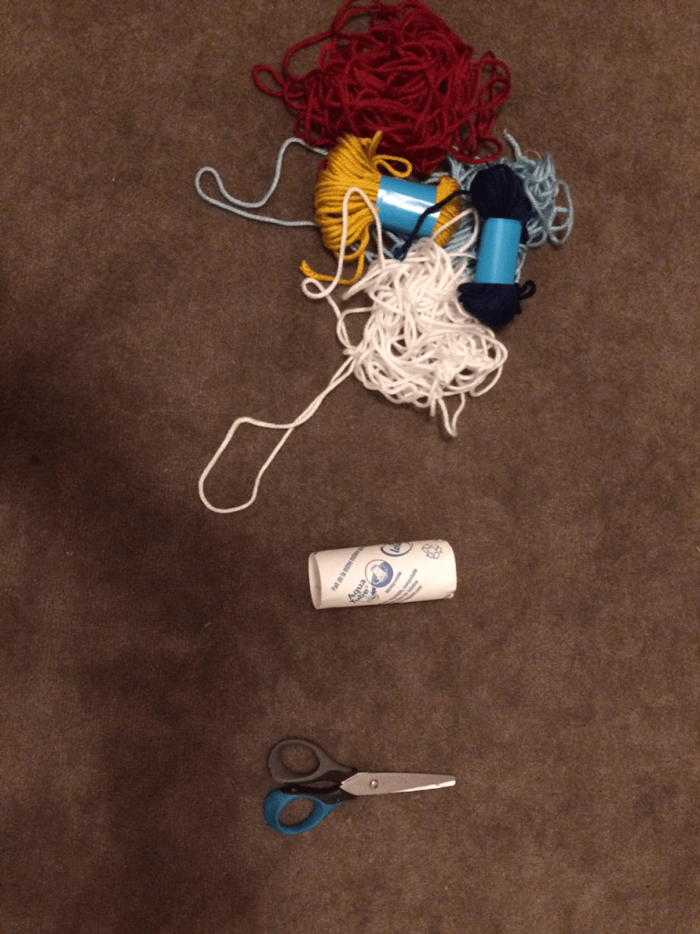 1️⃣Il vous faudra de la laine de une ou plusieurs couleurs, une paire de ciseaux, et un rouleau de papier toilette :