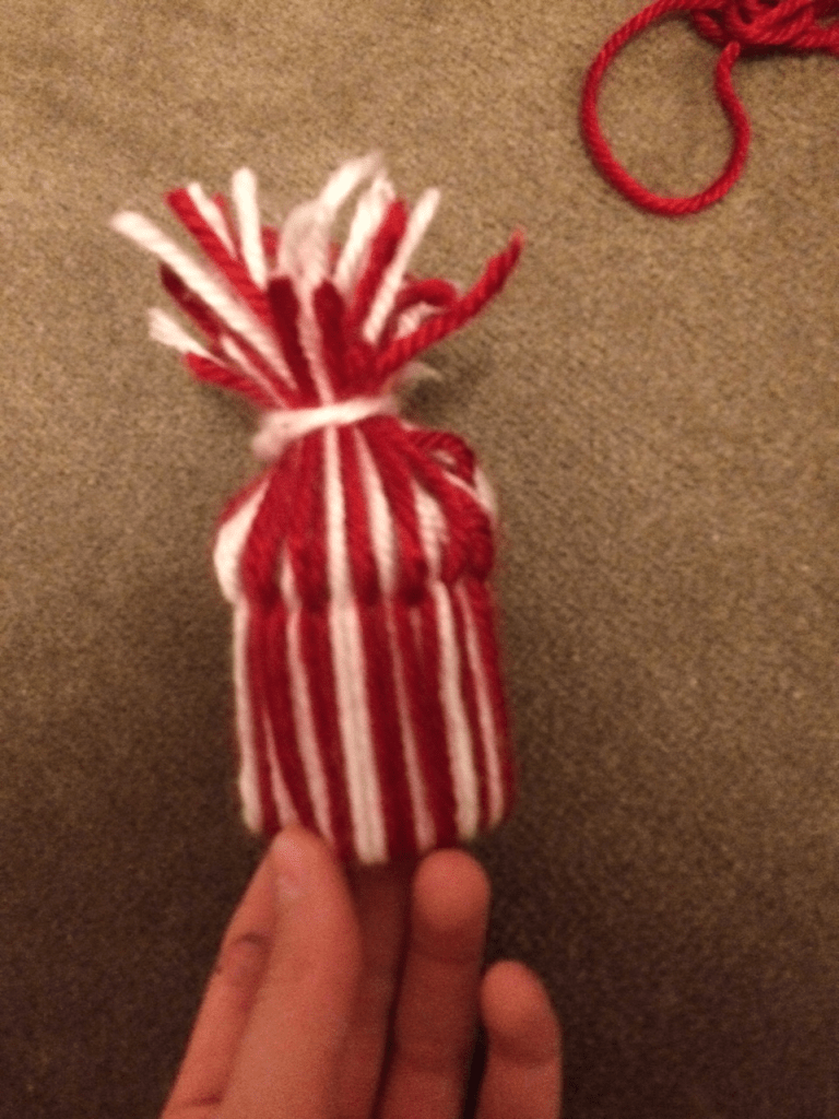 7️⃣ Prenez un autre petit fil de laine et passez le sous tout vos autres fil qui dépassent: