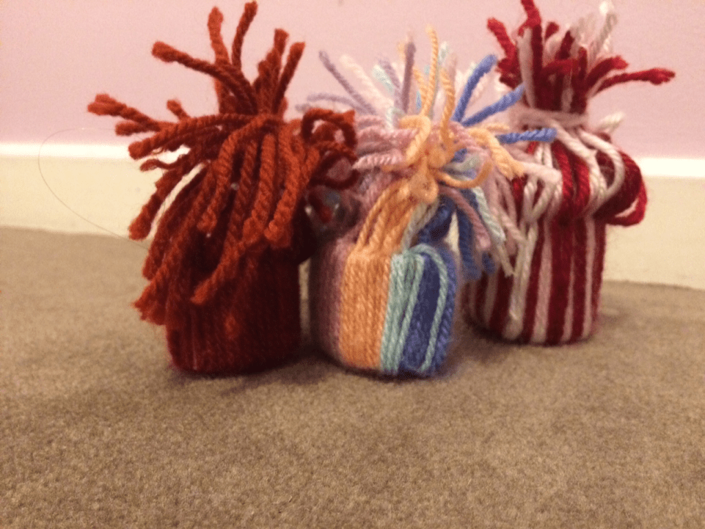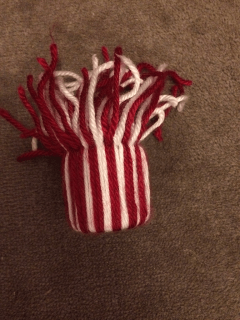 3️⃣Découpez des morceaux de laine de la ou les couleurs de votre choix de environ 33 cm( tout cela dépend de la longueur de votre morceaux de papier toilette)!